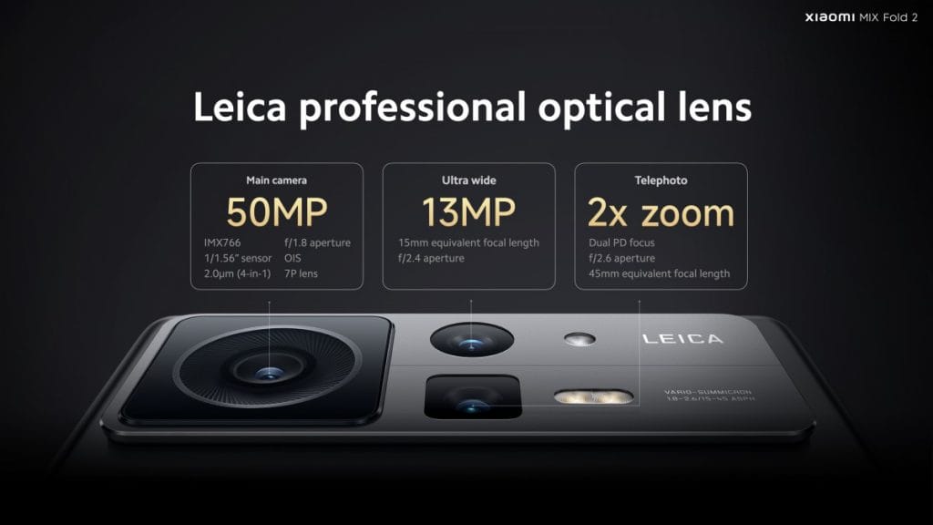 Mix Fold 2, aynı zamanda Xiaomi'nin Leica ile gerçekleştirdiği ortaklık sonucunda Leica kameralara sahip ikinci Xioami telefonu olma ünvanını taşıyor. Arka tarafta 50MP çözünürlüğünde Sony IMX766 sensörlü, Leica optikli ve OIS (Optik Görüntü Sabitleme) destekli ana kamera yer alıyor.