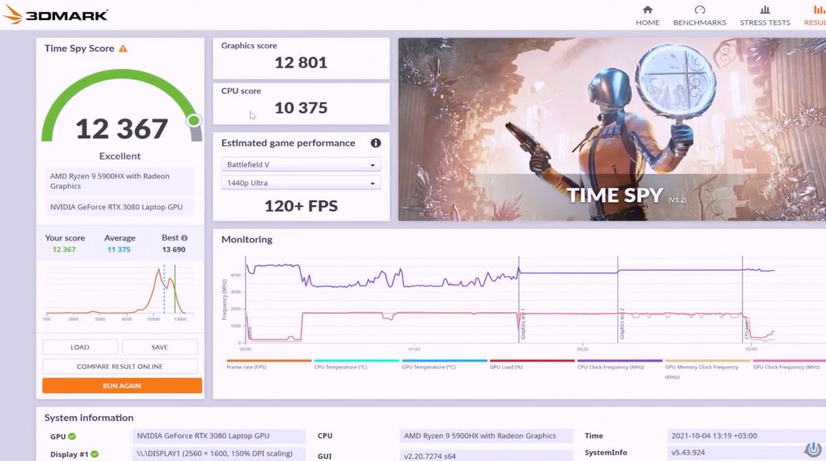 İlk testimiz performans, sonrası ise oyun testleri olacak. Performans testlerinde yine bilindik bir sistemi kullanacağız. 3DMark TimeSpy Test Sonuçları - Full HD Teste baktığımız zaman, sonuçlar gerçekten iddialı çıktı. Yani baştan beri anlattığımız özelliklere yakışır sonuçlar elde edildiğini söylemek lazım. Cihaz tüm skorlar içerisinde 12.367 puan almayı başarıyor. Burada grafik puanı kısmında ise 12.801 puan gibi çok iddialı bir değer görüyoruz. Yine işlemci puanı da 10 bin üzerine çıkıyor ve 10.375 puana ulaşıyor. İddialı sonuçlar alındığını bir kez daha hatırlatalım. Bu sonuç tüm sonuçların %93’ünden daha iyi değerleri ortaya koyuyor.- Tüm sonuçlarda: 12.367 puan