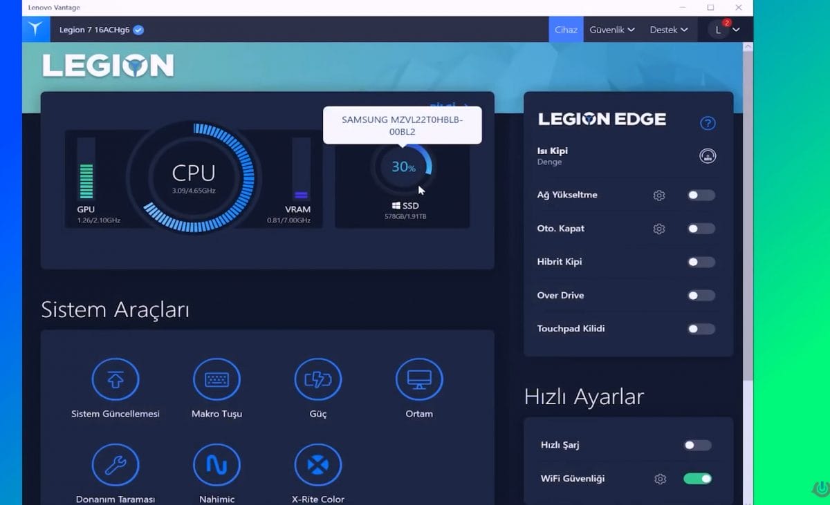 Tüm sistemi kontrol etmeniz için bir de yazılım artısı var. Lenovo Vantage yazılımı üzerinden hangi ayarı yapmak istiyorsanız bu ayarı yapabiliyorsunuz. Menüler oldukça anlaşılır tutulmuş ve grafiklerle her detay aktarılmış.
