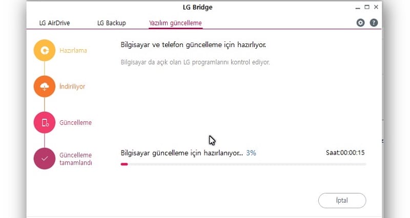 NOT : Hangi güncelleme yöntemi olursa olsun cihazın mutlaka %50 şarjı bulunmasına ve çıkabilecek potansiyel sıkıntılara karşılık bilgisayarınız veya herhangi bir hafıza biriminizde dosya/rehber yedeğinizin bulunmasına dikkat edin. Cihaz yedeğini isterseniz bilgisayara yüklenen LG Bridge uygulamasından veya Airdrive üzerinden yapabilirsiniz.