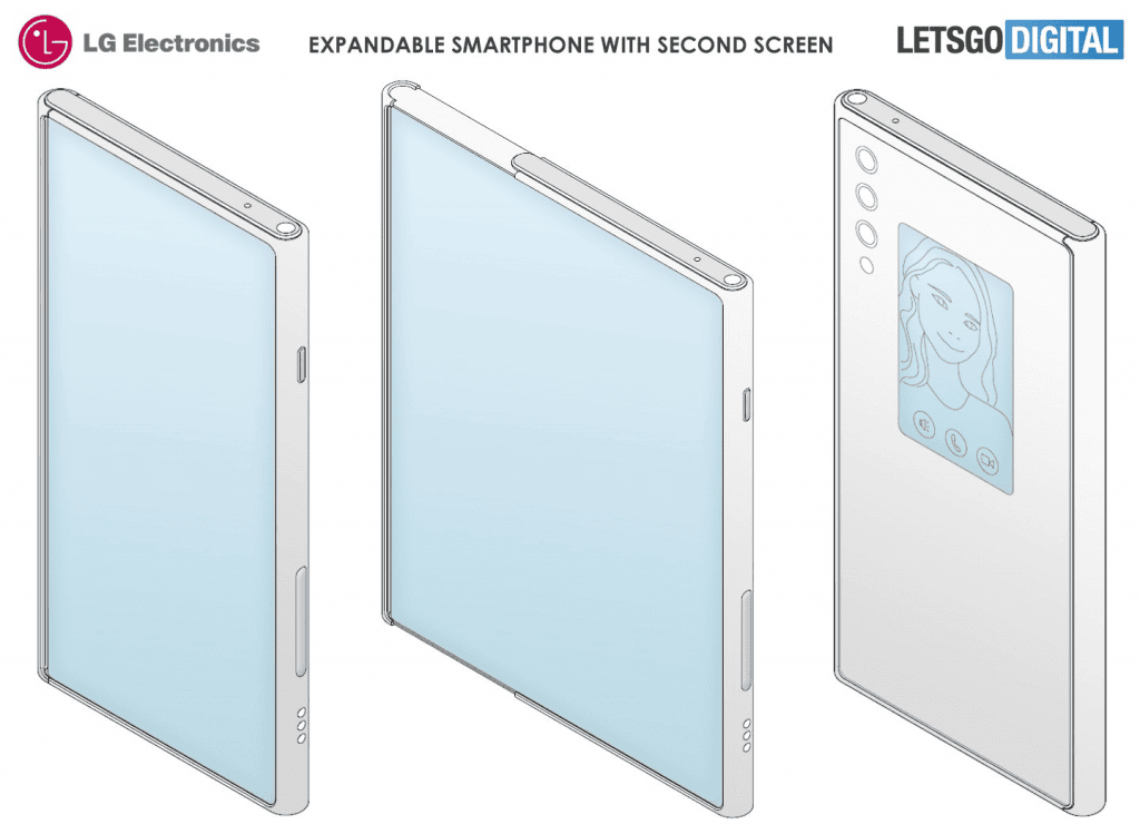 Önceki patentler, dar ekran kenarlarına ve telefonu açtığınızda yaklaşık %40 oranında artırılabilen yuvarlak bir ekrana sahip bir cihazı göstermektedir, yani cihazı aynı zamanda tablet olarak da kullanılabilirsiniz. LG, kayma işleminin sorunsuz olması için, ancak genişletilmiş konumda görülebilen bir ray sistemi kullanıyor. Cihazın arkasında üçlü bir kamera kurulumu görebilirsiniz.