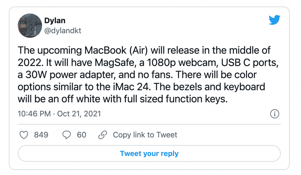 Apple analisti ve iOS geliştiricisi @dylandkt, yakın zamanda paylaştığı bir Twitter gönderisinde, bir sonraki Macbook Air modelinin 2022 yılının ortasında piyasaya sürüleceğini ve MagSafe teknolojisi, 1080p web kamerası, USB-C bağlantı noktaları ve 30 watt'lık bir güç adaptörü ile geleceğini iddia etti. Sızıntı yapan kişi, ince dizüstü bilgisayarın herhangi bir aktif soğutmaya sahip olmayacağını belirterek, 24 inç iMac'e benzer renk seçenekleri olacağını da sözlerine ekledi.