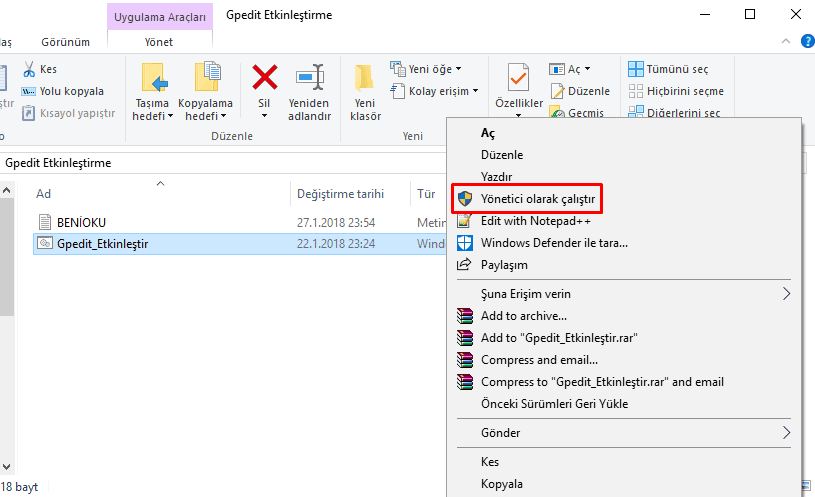 Gpedit_Etkinleştirme.bat dosyasına sağ tıklayın ardından Yönetici olarak çalıştırın.