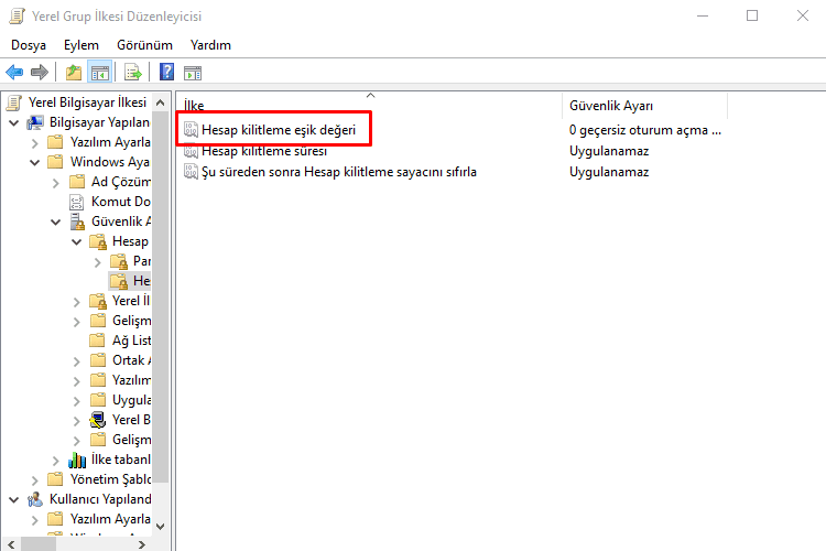 - Bilgisayar Yapılandırması->Windows Ayarları->Güvenlik Ayarları->Hesap ilkeleri->Hesap Kilitleme İlkesi yolunu izleyin.