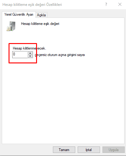 Hatalı giriş değerini 0-999 aralığında ayarlayabilirsiniz. Eğer değere 0 atarsanız hesap hiç bir zaman kilitlenmeyecektir.