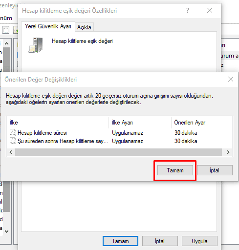 - Şu süreden sonra Hesap kilitleme sayacını sıfırla ilkesi hatalı denemelerin üzerinden belirlediğiniz süre geçtikten sonra hata sayacını sıfırlayacağını gösteriyor. (Emin olmamakla beraber) Değere 0 atarsanız sayaç geçen süreye aldırmaksızın sıfırlanmayacaktır.