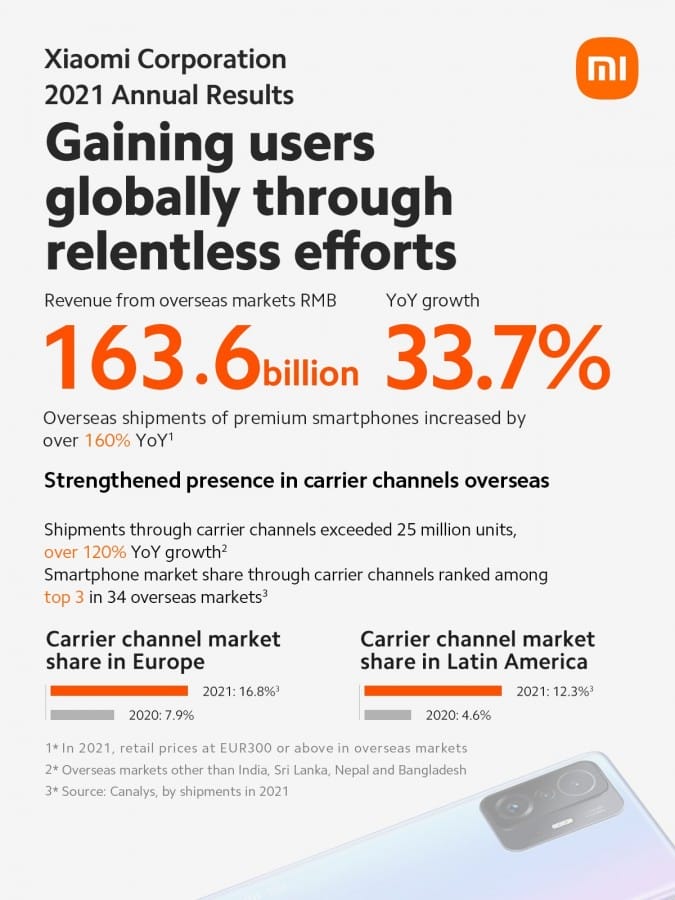 Akıllı telefon pazarından elde edilen toplam gelir 208,9 milyar Çin Yuanı oldu. Mutlak sayı yüzde 37,2'lik bir büyümeyi ortaya koyuyor fakat gerçekte telefon başına ortalama gelir 1,097 Çin Yuanı. Xiaomi, küresel varlığını genişletmeye devam ediyor ve mali rapor, toplam gelirin neredeyse yarısının denizaşırı pazarlardan geldiğini ortaya koyuyor. 2020 yılına göre parasal değerde yüzde 33.7'lik artışla 163.6 milyar Çin Yuanı.