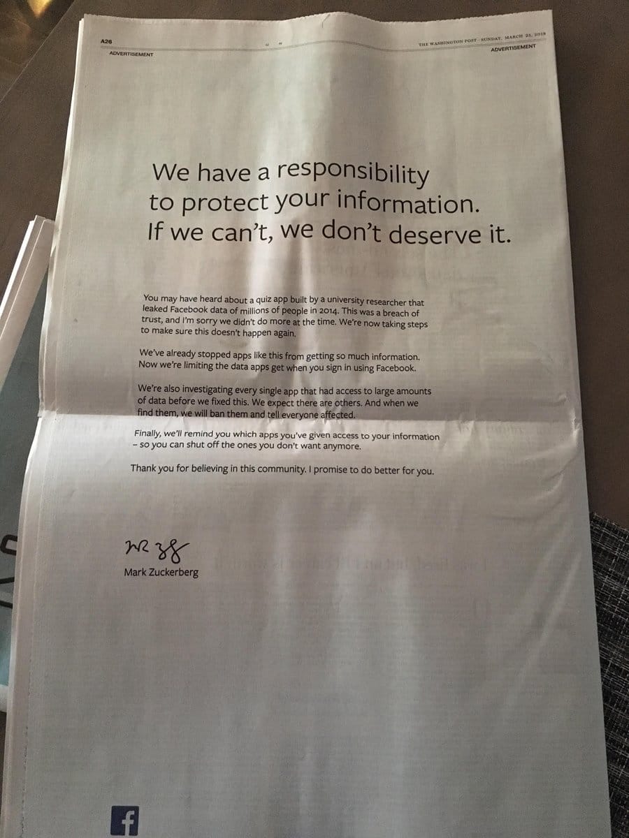 Bugün Facebook, İngiliz gazetesine ve Amerikalı gazetelere tam sayfa reklamları yayınladı. Cambridge Analytica veri gizliliği skandalı için sosyal ağları yasal ve düzenlemelere kabul ettiğini beyan eden bir yazı yayınlandı.