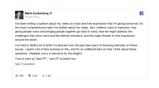 Facebook CEO'su Mark Zuckerberg, yarın Facebook üzerinden açacağı bir Canlı Yayın ile konuşma özgürlüğü konusunda "filtrelenmemiş bir oturum" sunacak. Zuckerberg bu canlı yayın planlaması hakkında şu sözleri dile getirdi: