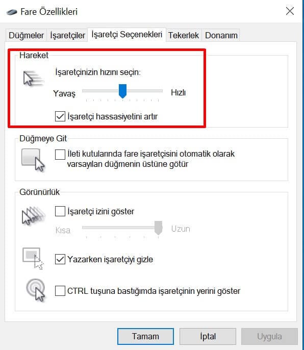 Hareket başlığı altında yer alan ayarların ilk sırasında işaretçinizin hızını seçin alanından hız seviyenizi belirledikten sonra işaretçi hassasiyetini artır kutucuğunu tikli hale getirip alttaki uygula butonuna tıklayarak ayarlarımızı kaydediyoruz.