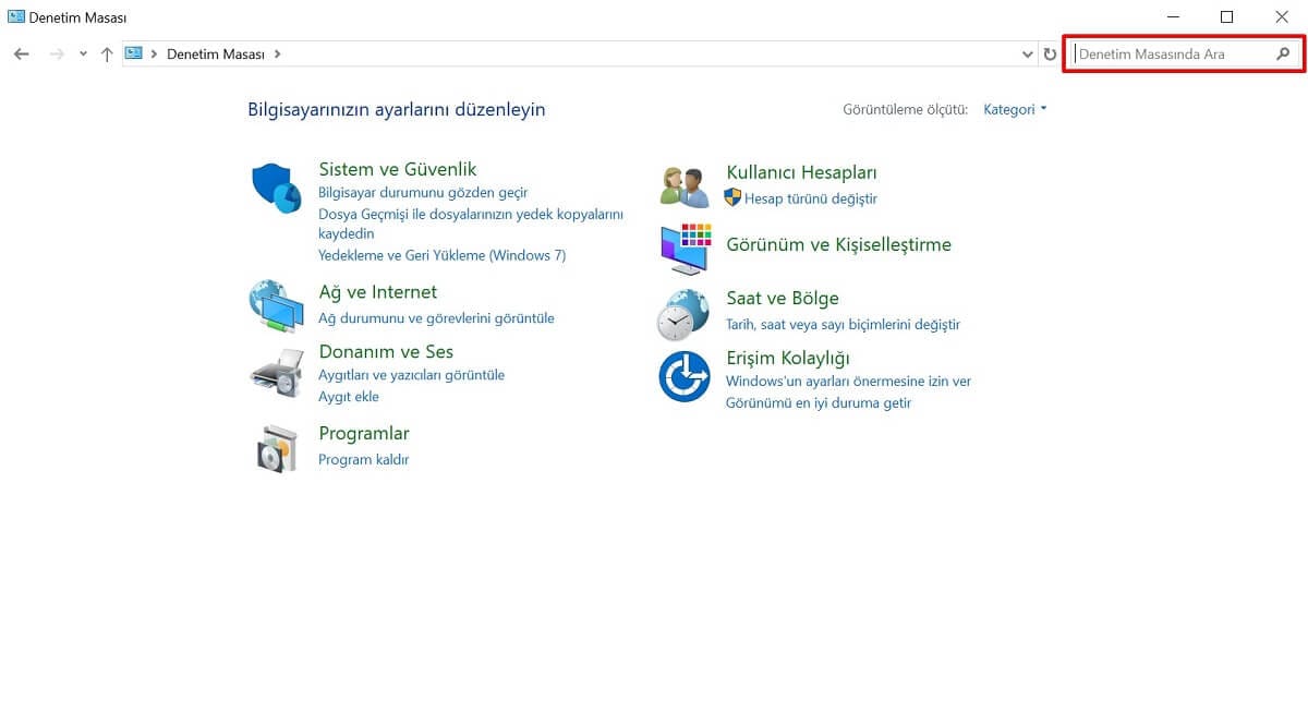 1-) İlk olarak denetim masasına giriyoruz. Açıldıktan sonra sağ üst tarafta yer alan arama yerine