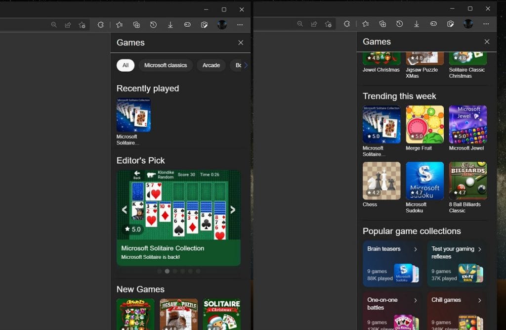 "Oyunlar" sekmesine erişebilmek için adres çubuğunuzun yan tarafındaki indirmeler, geçmiş ve diğer ikonların arasına eklenen oyun kolu ikonuna sahip butona tıklamanız yeterli olacak. Butona tıkladıktan sonra tarayıcınızın sağ tarafında Koleksiyonlar sekmesine benzer yeni bir panel görünüyor olacak. Bu panelde Solitaire, Mahjong Arcade gibi oyunların yanı sıra ücretli/ücretsiz tek oyunculu ve çok oyunculu çeşitli oyunlar listelenecek.