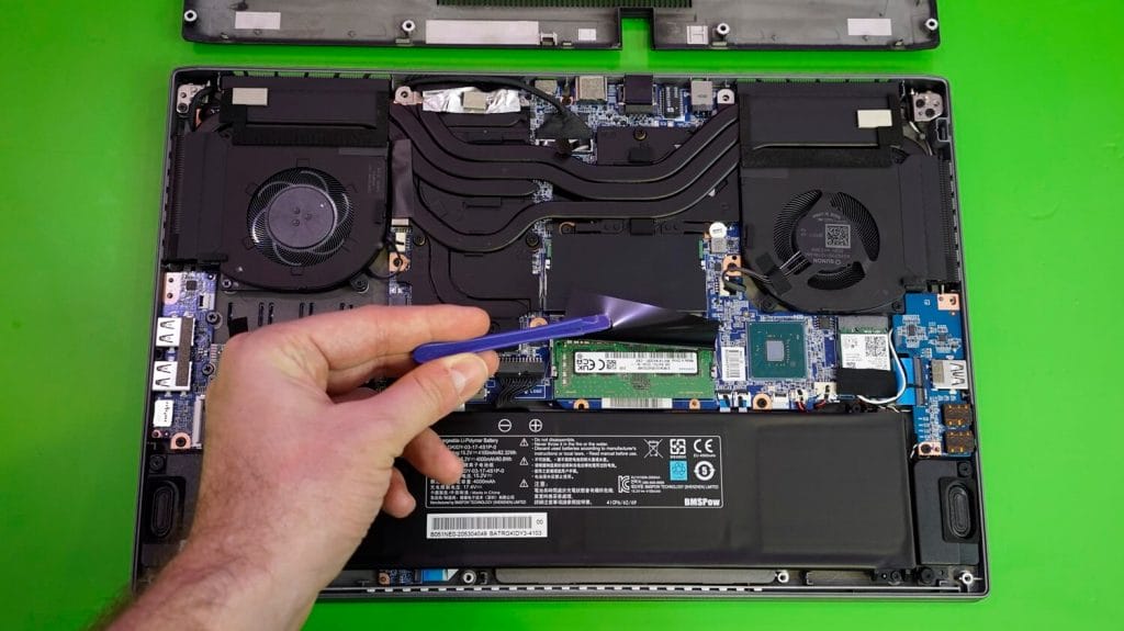 Şimdi ise sıra cihazın iç kısmını göstermeye geliyor. Kullanılan config'lere bir bakmamız gerekiyor. Yani, içerisinde hangi parça var ve neden nasıl kullanılmış. Dikkat ederseniz sağ ve sol tarafta çift fan yerleştirildiğini görüyoruz. Orta kısımda bakır ısı boruları ile CPU ve GPU'ya temas ettiğini görüyoruz. Hemen altında ise çift slot RAM'ler yer alırken, sol tarafta M.2 SSD ve onun altında batarya bulunuyor.