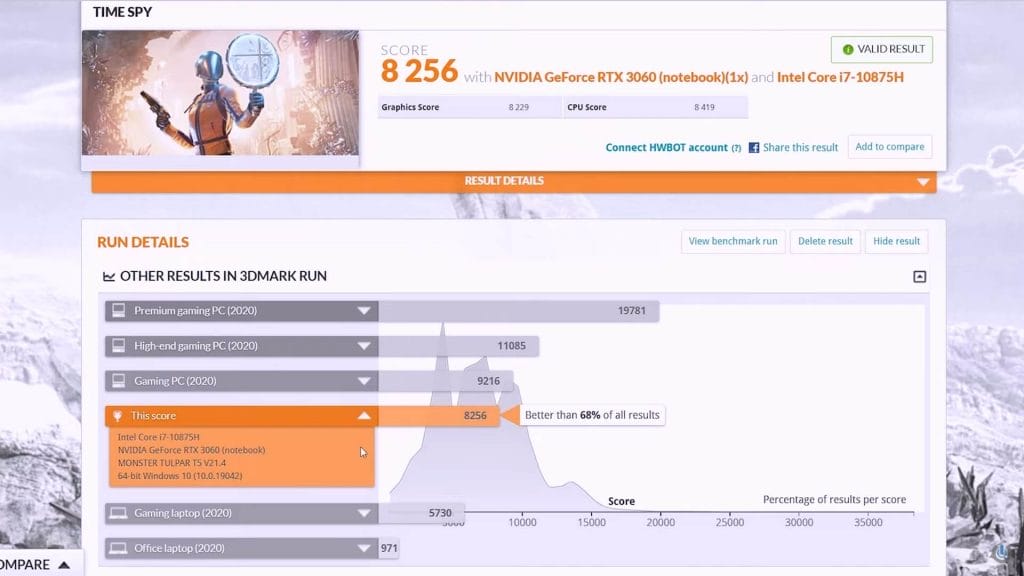 Bu bilgisayarı bir kıyaslama yapmak gerekirse Monster Tulpar T5, 8256 puan alarak tüm sonuçların %68'inden daha iyi bir konumda yer alıyor.