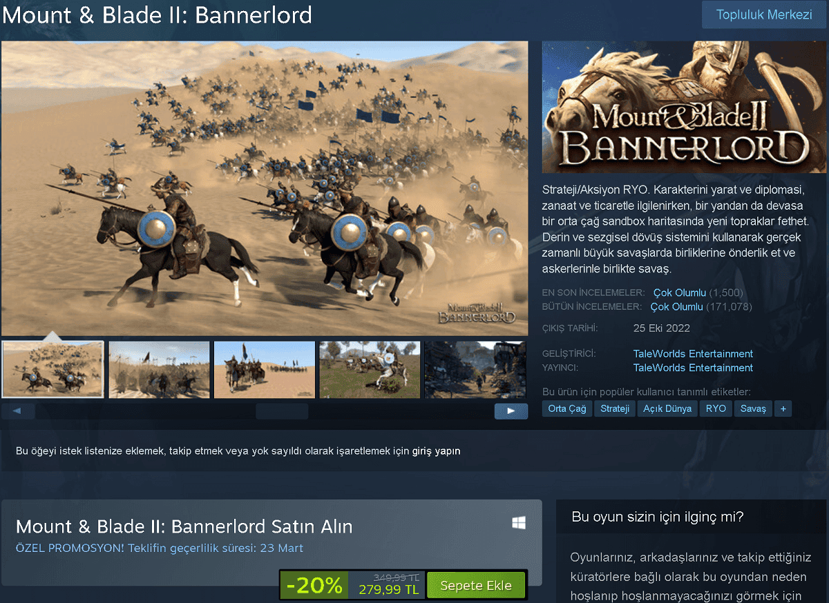 Orta çağ oyunu olarak bilinen Türk yapımıMount and Blade II: Bannerlord Steam'da göründü. Oyunun sistem gereksinimleri de belli olduğu gibi, çok yakında Steam üzerinden satın alınabilir olacak. Ancak oyunun piyasa satış fiyatı henüz netleşmedi.