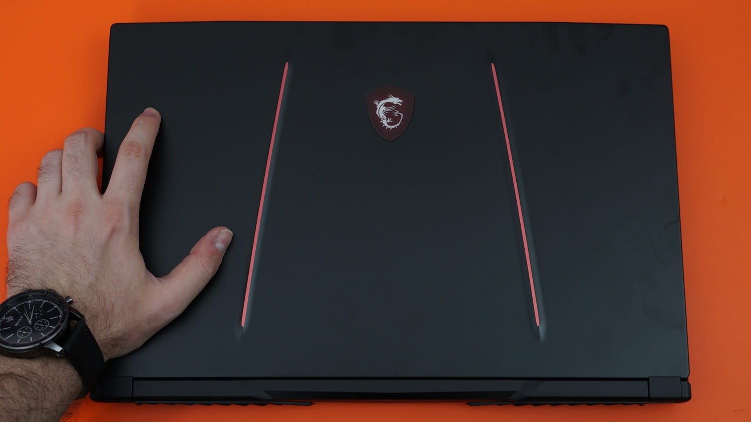 Arka kapağa baktığımızda ortada MSI'ın kırmızı ejderha logosunu görüyoruz. Logonun her iki yanında ise yukarıdan aşağıya ters paralel iki kırmızı şerit eklenmiş. Bu görüntünün esasen tasarıma agresif ve dinamik bir hava kattığını söylemeliyiz. Taban kısmında ise çeşitli havalandırma kanalları dikkat çekiyor. Ancak göze en hoş gelen şeyin, bu bölümde çeşitli şekillerle süslenmiş olması.