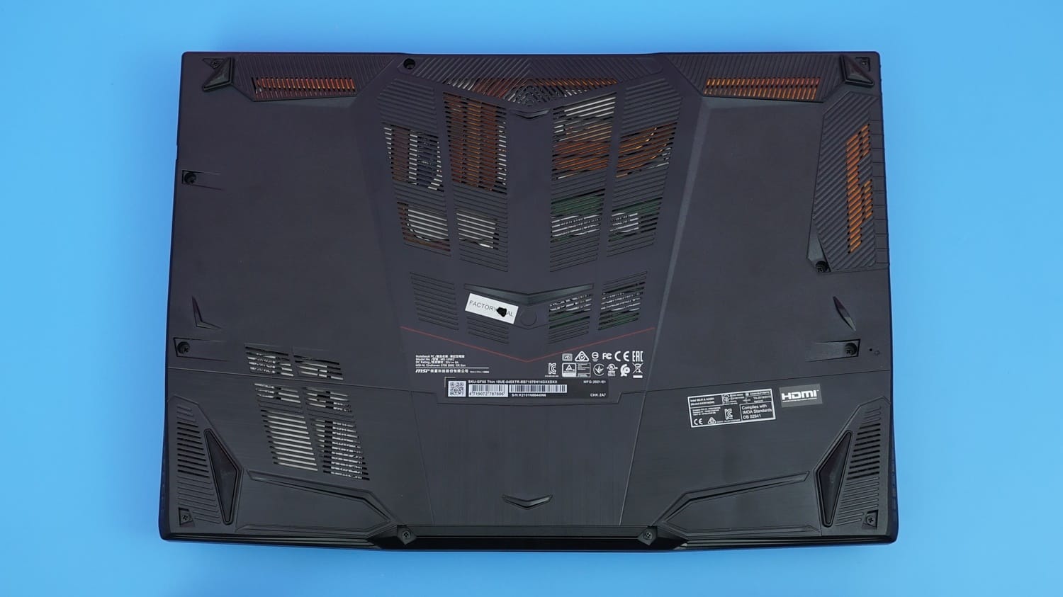 GF65 Thin'in genel tasarımında siyah hakim renk olsa da, kırmızı süslemeler bu tasarımın sadeliğini biraz olsun dinamikleştiriyor. Kapak logosu ve klavye tuşlarının çerçeveleri kırmızı şeritlerle çevrilmiş. Alt kısımda ise havalandırma ızgaraları dikkat çekiyor. Izgaralar son derece şeffaf kalmış zira içerdeki soğutma sistemi neredeyse seçilebilir durumda. Özellikle bakır ısı borularını görmek mümkün.