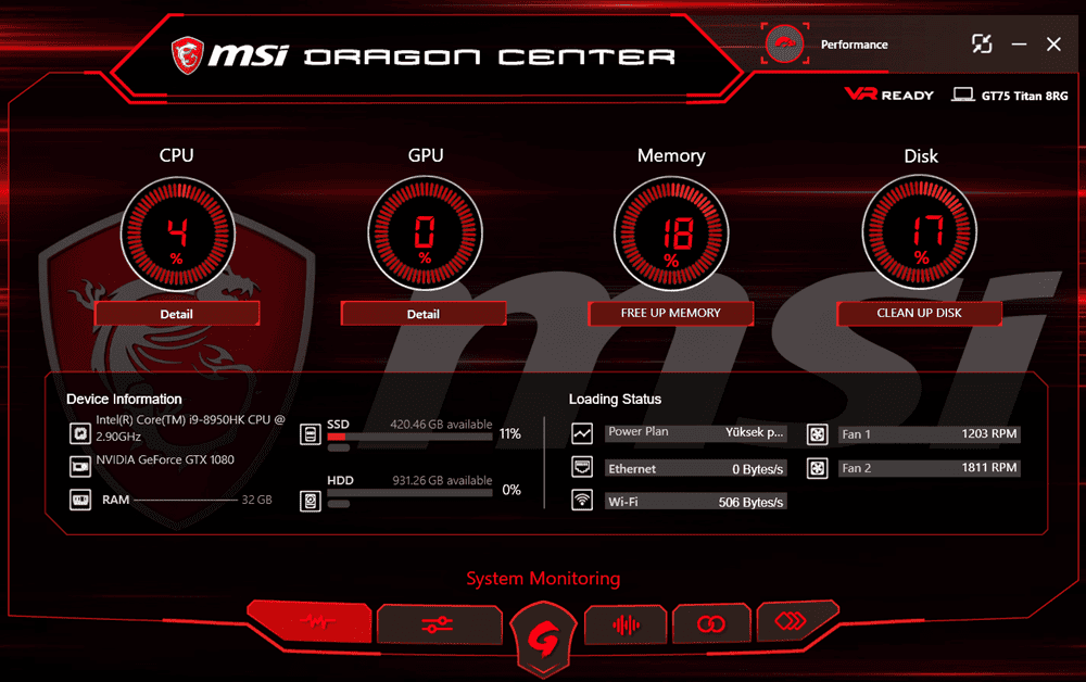 Yazılım desteğine baktığımızda ise MSI GT75 Titan 8RG laptop, güncel oyun teknolojileri olan NVIDIA GameWorks, Ansel ve VR, TriDefVR özelliklerinin tümünü destekliyor. MSI'ın kendi imzasını taşıyan Dragon Center 2.0 ile de laptop üzerindeki tüm kontrolü sağlayabiliyorsunuz. Yine ses geliştirmeleri için sunulan Nahimic 3 de, oyun ya da film deneyiminize etki edecek geliştirmeler sunuyor. Klavye makro atamaları için SteelSeries Engine 3'de yine yazılım desteğinde karşımıza çıkmakta. Son olarak MSI, oyun yayıncılığı için kullanılan XSplit Gamecaster V2.9 programını 1 yılllık lisansını da laptop ile birlikte ücretsiz sunmakta. Bu da profesyonel oyuncular için iyi bir hediye olmuş.