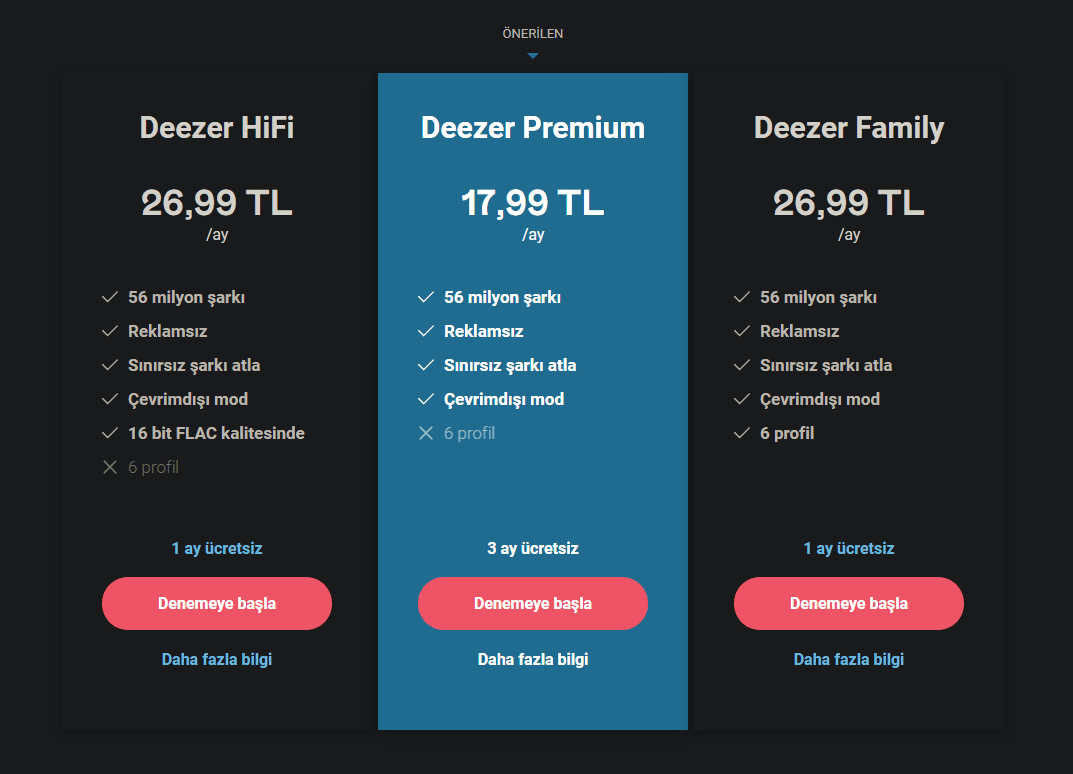 Görselde de görmüş olduğunuz üzere Deezer, üç farklı abonelik seçeneği sunuyor. HiFi deneyimlemek isteyen kişiler aylık 26,99 TL ödeyip bu seçenekten yararlanabilirler. Deezer Family ise 6 profile kadar sunduğu destek ile oldukça hoş bir seçenek sunmuş.