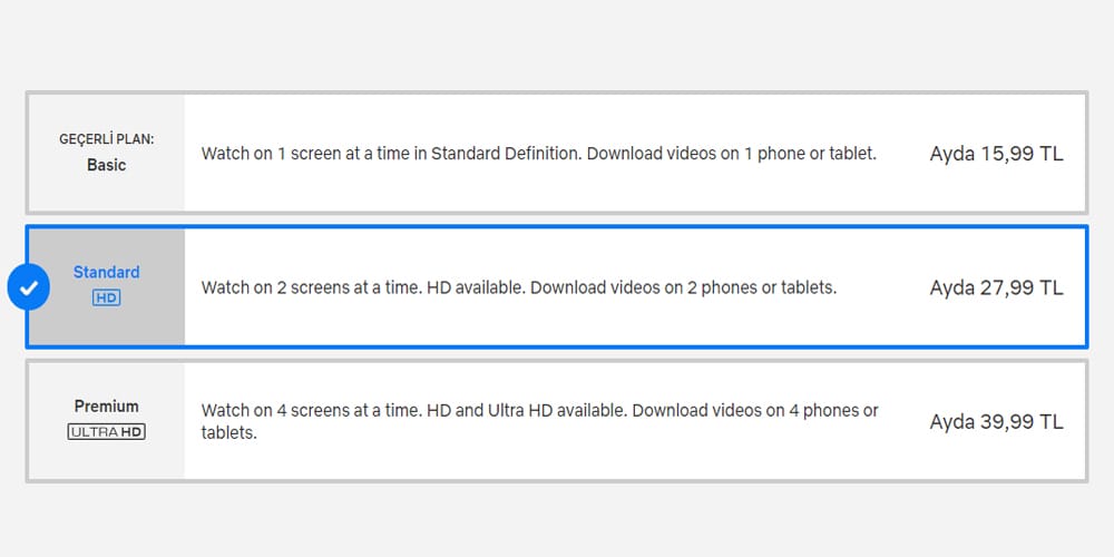 Yeni zamlarla birlikte Netflix'in SD kaliteli tek kişilik abonelik fiyatı aylık 19.99 TL oldu. İki kişinin kullanabildiği standart HD paketin fiyatı 33.99 TL olurken, dört kişilik 4K destekli fiyat 49.99 TL olarak değişti.