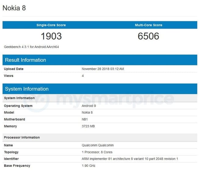 Resimde de gördüğünüz üzere Nokia 8, tek çekirdekte 1903 puan alırken, çoklu çekirdekte 6509 puan almayı başardı. Testler yapılır yapılmaz paylaşıldı. Yani bu sonuçlar 28 Kasım'da yapıldı.