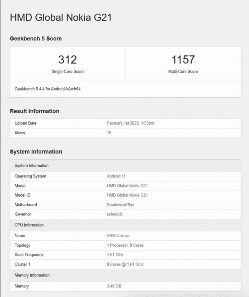 Yakın tarihli bir Geekbench listesinde Finlandiya merkezli teknoloji şirketinin Nokia G21 üzerinde çalışmalara başladığını öğrenmiş olduk. Geekbench testine göre akıllı telefon 4GB RAM'e sahip olacak ve Unisoc T606 yonga setinden güç alacak, yazılım tarafında ise Google'ın Android 11 işletim sistemini çalıştıracak olan Nokia G21; tek çekirdek testinde 312 puan ve birleşik çok çekirdek testinde 1,157 puan almayı başardı.