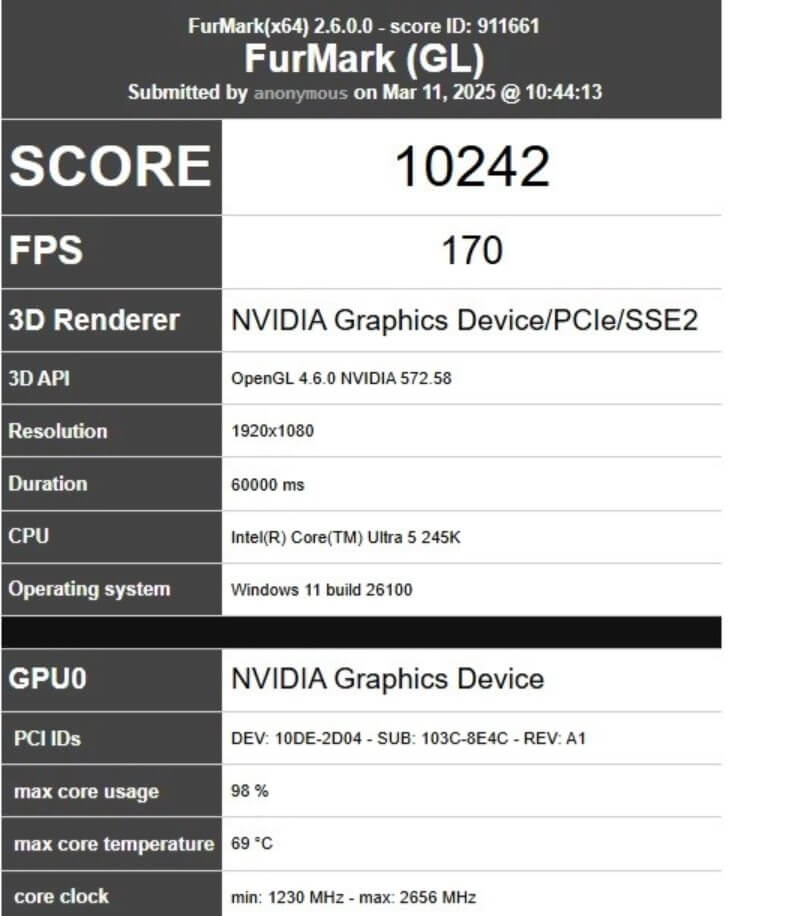 Konuyu sıkı takip edenlerin bildiği üzere daha öncesinde GB206 GPU kalıbının yeni modelde kullanılacağı öne sürülmekteydi. Keza şu anda da yeni sızıntılar bu durumu doğruluyor. Test sonuçlarına göz attığımızda ise RTX 5060 Ti, FurMark testinde