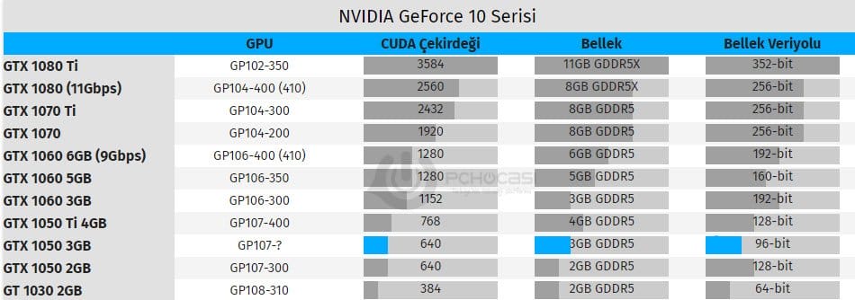 Ekran kartının teknik detayları henüz netleşmedi. Fakat üç aşağı beş yukarı detaylar gelmeye devam ediyor. Aşağıdaki tablodan sizlere diğer ekran kartları ile birlikte olan karşılaştırmalarını ekledim. 96 bit veri yoluna ve 640 CUDA çekirdeğine sahip olması beklenen NVIDIA GTX 1050 3GB modeli aynı zamanda Computex 2018 fuarında da duyurulması bekleniyor.