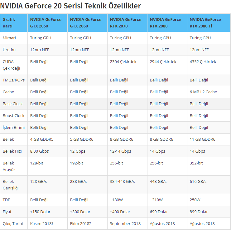Ortalama 32 saat içerisinde Gamescom'da düzenlenecek olan NVIDIA etkinliğinde yeni RTX serisini göreceğiz. Ancak öncesinde NVIDIA RTX 2070 ekran kartının özellikleri ve piyasa satış fiyatları da ortaya çıktı. Zira daha önceden temin etmiş olduğumuz bilgiler ile birlikte tüm serinin fiyatlarını da tabloya ekledik. Gelin yakından bir göz atalım.