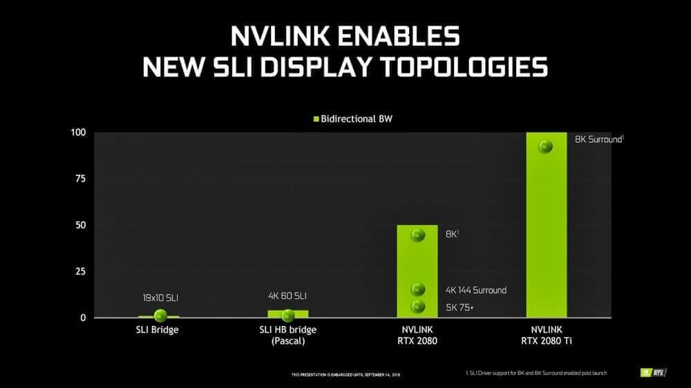 Değişen arayüz sayesinde yeni çoklu GPU teknolojisi RTX 20 serisine yerleştirilerek tek yönlü bant genişliği 100 GB/sn kadar ulaştı. Çift yönlü bant desteği ise 25 GB/sn kadar ilerledi. Bu sayede bu kadar bant genişliğini destekleyebilecek yeni bir teknoloji olması gerekiyordu. Sonrasında NVLink karşımıza çıktı.