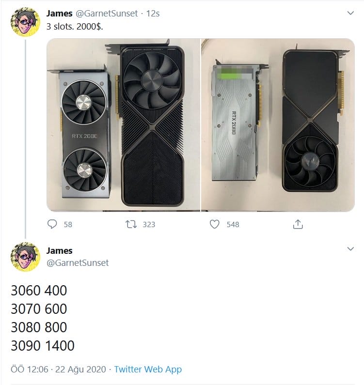 NVIDIA RTX 3090 ekran kartının fotoğraflarını internete sızdıran kişi ile bu ekran kartlarının fiyatlarını bir bir sızdıran kişi aynı kişi; James (@GarnetSunset) isimli bir arkadaşımız.