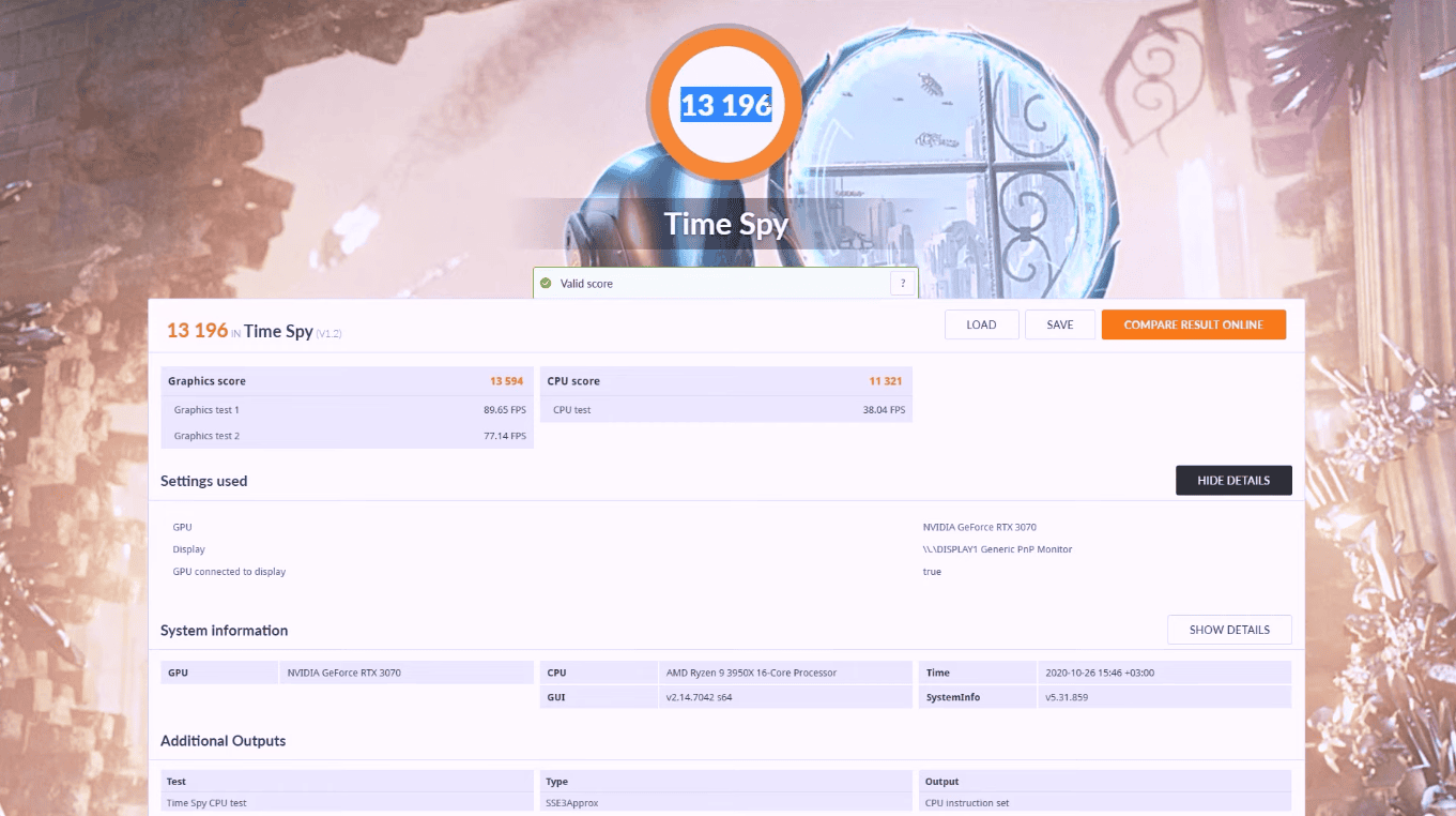 Peki kart performans tarafında neler sunuyor? Bunu ölçümlemek için çeşitli render ve oyun testleri gerçekleştirdik. İlk yaptığımız test, TimeSpy testi oldu. NVIDIA RTX 3070 ekran kartı, 3DMark TimeSpy testinde 13196 puan aldı. Aldığımız puanın detaylarına indiğimizde mevcut teste katılan tüm kartların yüzde 96'sından çok daha iyi bir skor elde ettiğini görüyoruz.