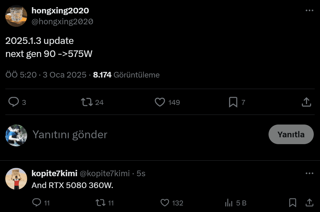Kopite7kimi bu arkadaşı bulacağım bir gün ama, şuanda verdiği sızıntıların hemen hemen hepsi doğru çıktı. Yine kendisinin X platformu üzerinden paylaştığı bilgide RTX 5090 575W TDP değerine sahip olduğu, hatta 5080'in de 360W TDP ile geleceğini