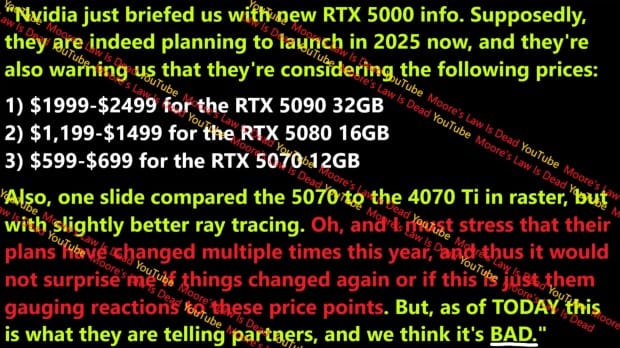 RTX 5090 ve 5000 serisinde yer alan diğer modellerin fiyatlarına dair yeni bir görsel daha sızdırıldı. Yeni sızıntılar doğrultusunda ise RTX 5090 32 GB modelinin 1.999$ ila 2.499$ civarında bir fiyat etiketi ile pazara sunulması bekleniliyor.