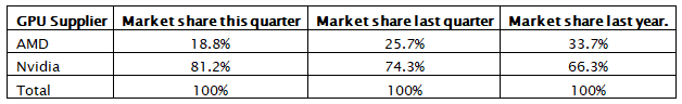 Yıllardır geliştirmiş oldukları teknolojileri piyasaya sunan AMD ve NVIDIA üreticilerinin GPU pazar payları ve son 10 yıl içerisinde nereden nereye geldiklerine dair detaylı bir rapor hazırlandı. Rapora göre NVIDIA şuanda pazarın %81.2'sine sahipken, AMD %18.8'e düştü. Ayrıca üreticiler için son 10 yılın en kötü dördüncü çeyreği yaşanıyor.