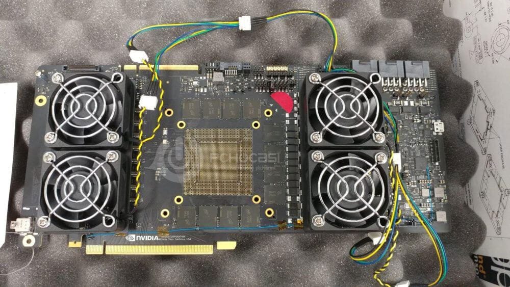 Aşağıda görmüş olduğunuz NVIDIA Turing mimarili grafik kartı modeli GDDR6 bellek teknolojisine sahip. Kartın üzerine şöyle bir baktığımızda ise üç adet 8 pinli güç konektörünün yer aldığını ve 12 modül Micron GDDR6 belleklerin göründüğünü söyleyebiliriz. Henüz şuanda net olmasa da bir de NVLink gibi görünen tam kestiremediğimiz detaylar mevcut.