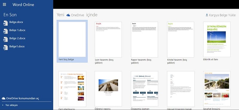 Sağ üst taraftaki "Office uygulamasını yükleyin" kısmıyla bir işimiz yok. Önümüzde kutu kutu duran "Çevrimiçi uygulamaları kullanın" başlığı altındaki uygulamalar, web tabanlı Office uygulamalarıdır. Herhangi birine tıkladığınız takdirde size aşağıdaki gibi bir sayfa çıkacaktır. Buradan boş sayfa, desenli veya farklı özelliklerdeki birçok şekildeki şablonlara ulaşabilir ve kolayca yazınızı, tablonuzu, sunumunuzu oluşturabilirsiniz.
