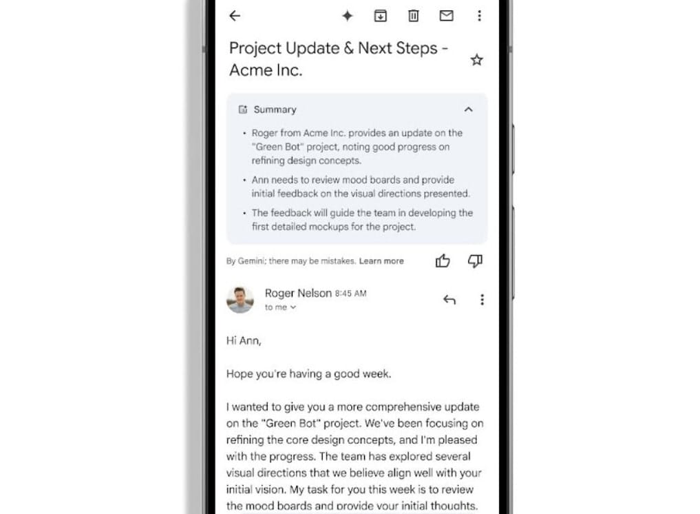 Yeni gelen özellikle birlikte Gmail uygulaması, gelen e-postaları yapay zekâ destekli olarak otomatik bir şekilde özetlemeye başlıyor. Yani uzun ve karmaşık içerikli bir e-postayı açmadan önce, üst kısmında bu e-postanın “ana fikrini” özetleyen kısa bir metin göreceksiniz.