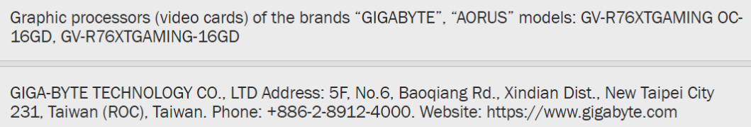 Gigabyte RX 7600 XT 16GB belleğe sahip ekran kartı modeli, firmanın yaptığı Avrasya Ekonomi Komisyonu'na yaptığı düzenleyici başvurusunda ortaya çıktı.