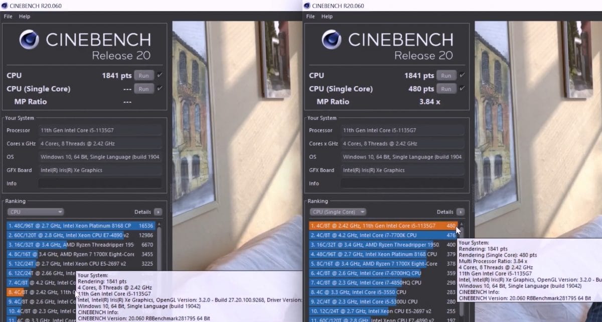 Tek çekirdek için sonuçlara baktığımız zaman cihazın içerisinde yer alan Intel Core i5-1135G7 işlemcinin 480 puan aldığı gözüküyor. Bu da seriyi çok iyi bir yere taşıyor. Çoklu çekirdek puanı kısmında ise alınan puanın 1841 puan olduğunu görüyoruz.