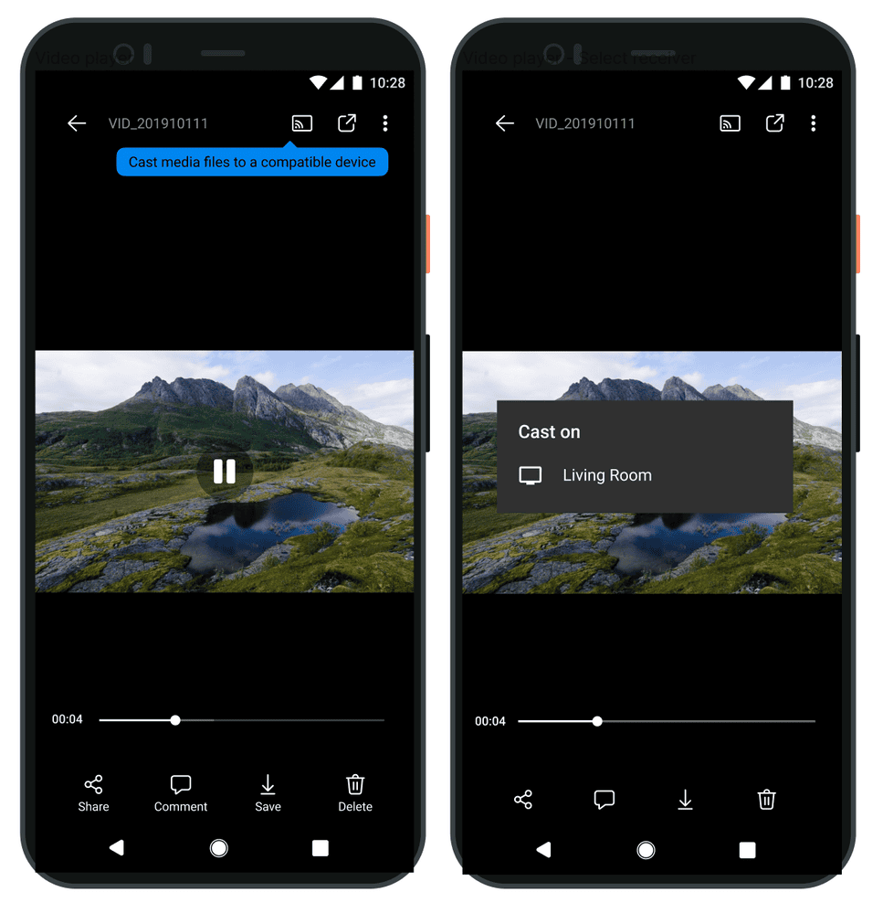Artık OneDrive fotoğraflarınızın ve videolarınızın keyfini Chromecast ile televizyonunuzda görüntüleyerek daha geniş bir formatta çıkarabilirsiniz. Medya dosyalarını Chromecast cihazlarda görüntülemek için telefonunuzu Chromecast özellikli bir cihaza bağlamanız, Android için OneDrive uygulamasını açmanız ve OneDrive ana sayfa sekmesinin sağ üst köşesindeki Cast simgesine dokunmanız yeterli olacaktır. Telefonunuzdaki fotoğraflar ve videolar arasında gezinirken, bunları Chromecast özellikli televizyonunuzda veya cihazınızda görebileceksiniz.