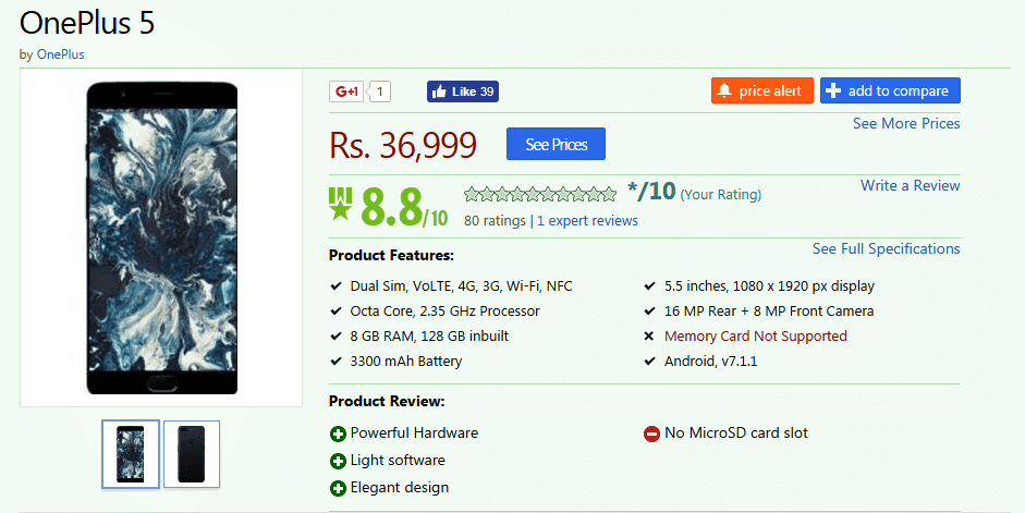 Zira bir iPhone 7 şuanda Türkiye'de 3500 TL'den başlarken, OnePlus 5'i 2400 TL ve civarında satın alabileceğiz. Zira aşağıdaki satış fiyatına baktığımızda bir Hint sitesi çoktan satışa çıkartmış. Parayı Euro'ya çevirdiğimizde ise karşımıza 513 Euro gibi bir fiyat çıkıyor. Onu da TL'ye çevirdiğimizde 2013 TL ve civarına tekabül edecek. Şimdi işin içerisinde vergi, kdv gibi detaylar da girdiğinde 2400 - 2500 TL rakamlarında cihazı satın alabilmemiz mümkün olacak.