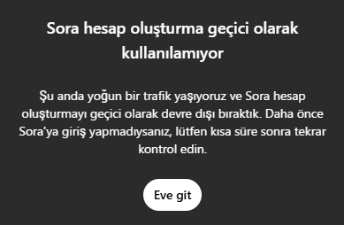 Fakat şuanda o kadar fazla yoğunluk var ki, ChatGPT Pro kullanıyor olmama rağmen hesabıma giriş yapamıyorum. "Şuanda yoğun bir trafik yaşıyoruz ve Sora hesap oluşturmayı geçici olarak devre dışı bıraktık. Lütfen kısa süre sonra tekrar kontrol edin." uyarısı aldığım için sıcak sıcak deneyemedim.