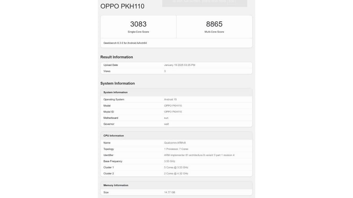 "PKH110" model numarası ile listelenen Oppo Find N5'in test sonuçlarına baktığımız zaman tekli çekirdek testinden 3.083, çoklu çekirdek testinden ise 8.865 puan elde etmeyi başardığını görüyoruz.