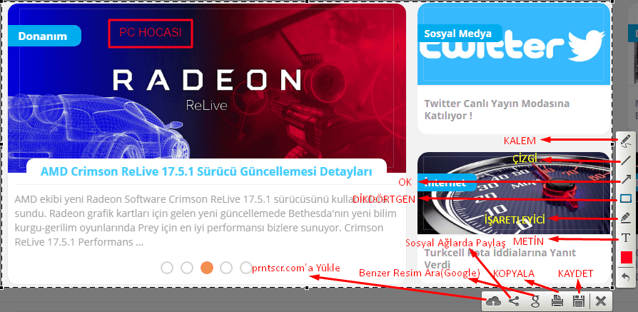 Benim en çok hoşuma giden seçtiğimiz alanı online bir siteye yüklemeye yarayan kısım. Normalde ekran görüntüsünü alıp, painte yapıştırdıktan sonra tarayıcıdan bir resim sitesine girip kaydettiğimiz resmi