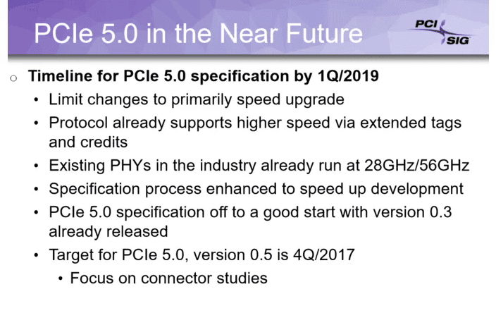 Ekim 2017 yılında geliştirici firma PCIe 4.0'ı duyurmuş ve AMD ile Intel 4.0 uyumlu işlemcilerini 2019'un ortalarında duyurabileceklerini belirtmişlerdi. Bu durum şuanda bir tık daha yukarıya çıkarak, PCIe 5.0 için konuşuluyor. Yetişir veya yetişmez orası ayrı ancak PCI-SIG firması çoktan 5.0'ı hazırladı.
