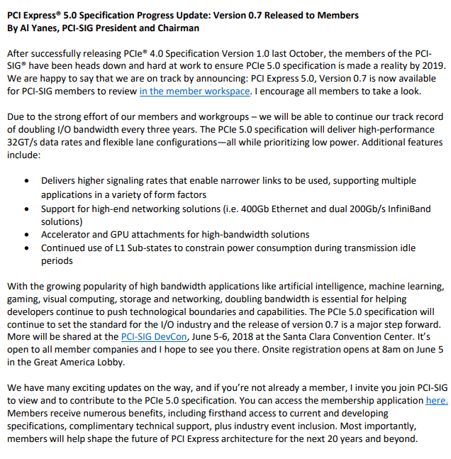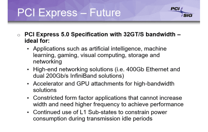 Şimdi ise PCI-SIG 2017 yılının başında geliştirmeye başladığı PCI-Express 5.0 arayüzüne geçişi hızlandırdıklarını açıkladı. Zira yeni şerit bant genişliğine uyum sağlayabilmek adına, piyasaya pek çok donanım sürülebilir. Veya yazılım güncellemesi ile mümkünse, çözüm üretilecektir.