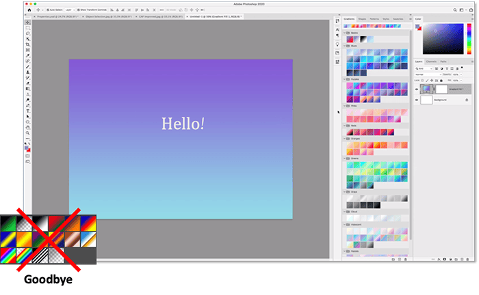 Adobe ayrıca degradeleri ve hazır ayarlar arabirimini de tamamen yeniden tasarlamış. Adobe, gradyanlar ve hazır ayar arabirimini de tamamen yeniden tasarladı. Her şey çok daha anlaşılır ve dahil edilmiş olan tuhaf Küçük Resim görünümünden daha kullanışlı görünecek düzinelerce yeni hazır degradeler içeriyor. Bu uygulama aynı zamanda fotoğrafa hızlıca birkaç renk ayarı uygulamanıza izin veren canlı hediye önizlemelerini de destekliyor.