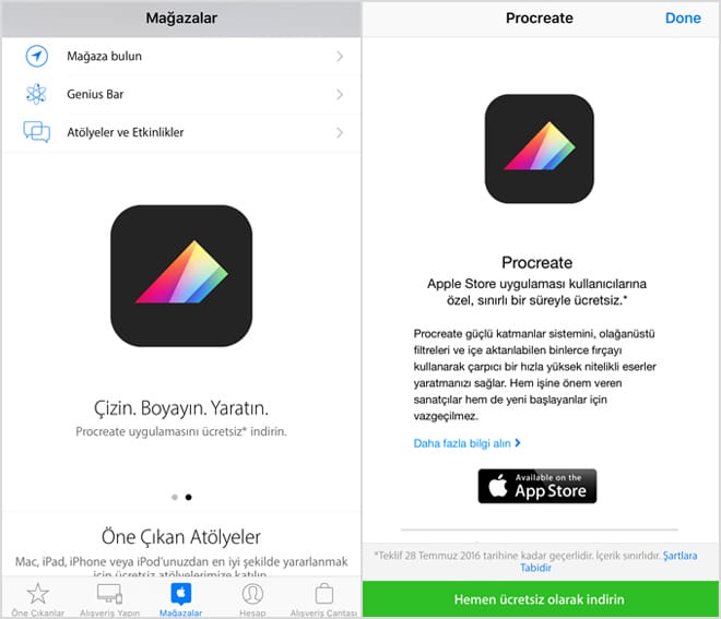 Normalde 7,99 TL'den satılan popüler çizim uygulaması şuandan itibaren ücretsiz olduğu gibi, indirmek için aşağıda paylaşmış olduğumuz iOS Store linkine tıkladıktan sonra telefonunuza indiriyorsunuz. Ardından uygulamanın içerisinden "mağazalar" bölümüne gidin. Ardından "Atölyeler ve Etkinlikler" yazan alanın hemen alt tarafında yer alan Procreate Banner'ına tıklayarak ücretsiz olarak yükleyebilirsiniz. Procreater uygulaması 28 Temmuz 2016 tarihine kadar ücretsiz olarak indirilebilecek. Uygulama hakkında sorun yaşarsanız, aşağıdaki yorum bölümünden bizlerle iletişime geçebilirsiniz.