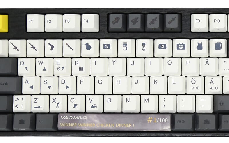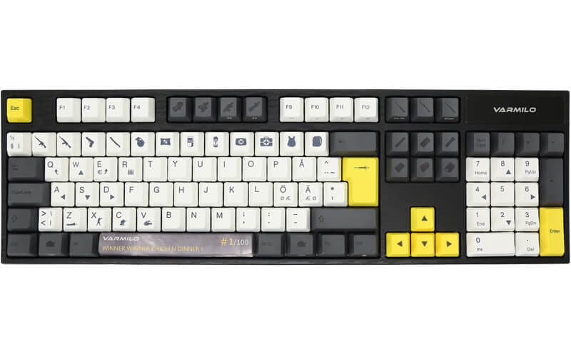 Varmilo tarafından PlayerUnknown's Battlegrounds'a özel olarak üretilen klavye üzerinde oyundaki eşyaların ikonlarını taşıyor. Sarı, gri ve beyaz renkleri üzerinde bulunduran tuşlar mekanik klavye özelliğini ürüne kazandırıyor.